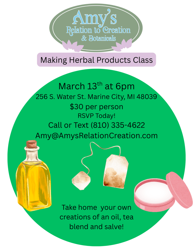 Come to this class to learn how to make tea blends, infused oils and salves. Take home your own creations of an oil, tea blend and salve!